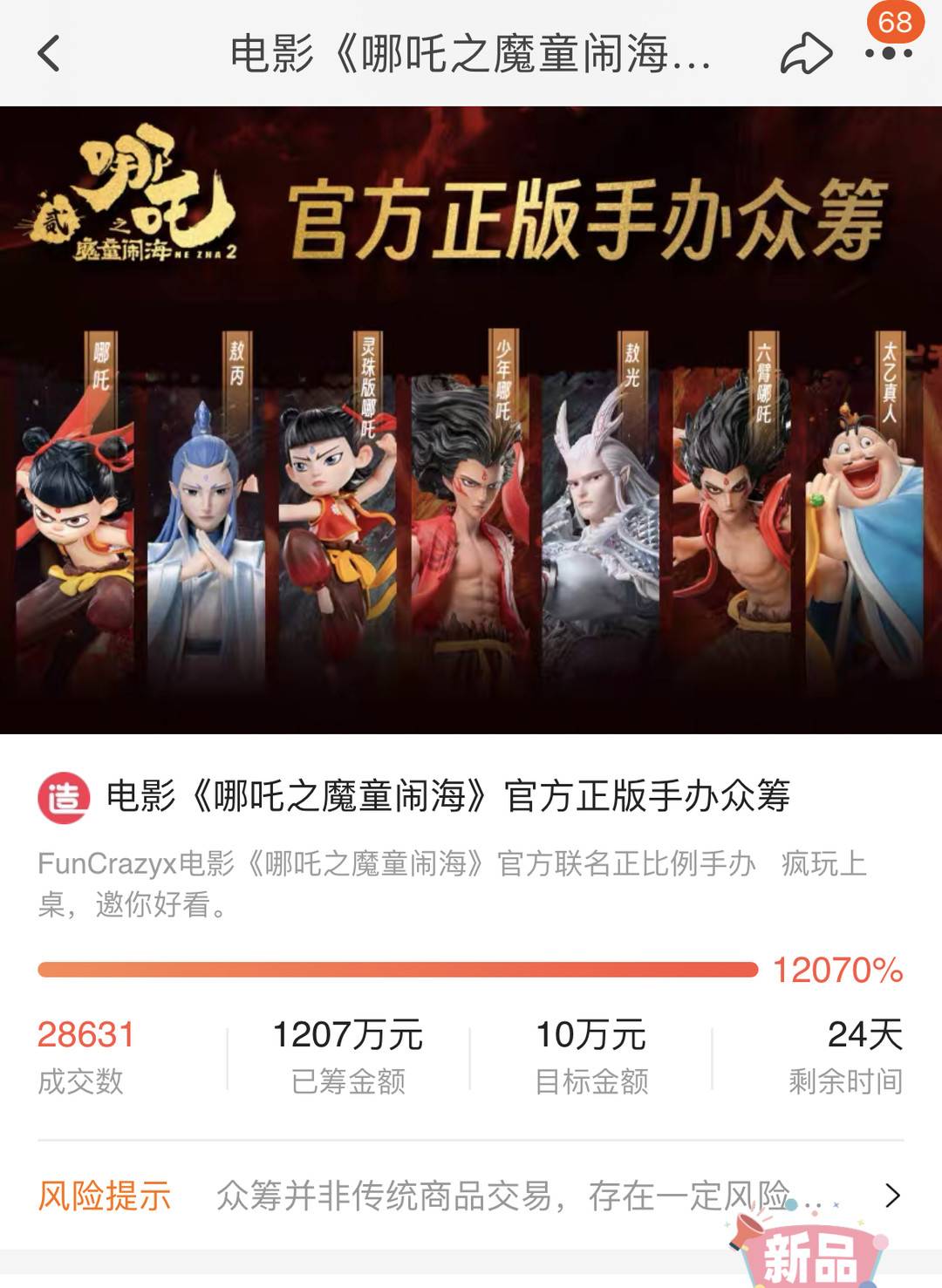 有意思的是★★,记者注意到★★,在电影持续火爆的同时★★,在网购平台上澳门太阳集团网站入口★★,由FunCrazy和《哪吒之魔童闹海》共同打造的官方正版手办众筹项目筹集资金正在一路狂飙★★,其众筹目标金额为10万元★★,但截至发稿已达到1207万元★★,完成率达到12070%★★。
